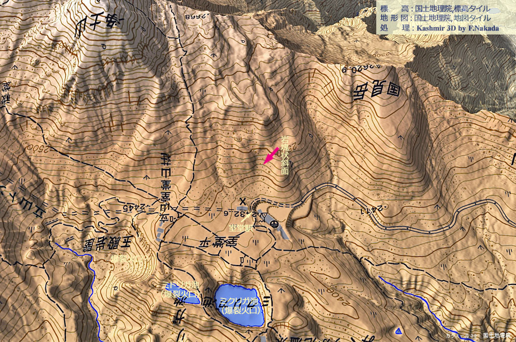 ‼マウスオーバー‼ 地図上にマウスを乗せてください。産総研・地質調査総合センターの 5万の1地質図幅「立山」(出典,下記)」を表示します。![]() 地形図に赤矢印で示した斜面は,事務局が「岩塊流(岩塊斜面)」ではないか,と考えている斜面です。 1/5万地質図幅「立山」では,溶岩となっていて,更新世~完新世の堆積物である,という記載はありません。 従って,岩塊流状斜面としてここに掲載しました。 |