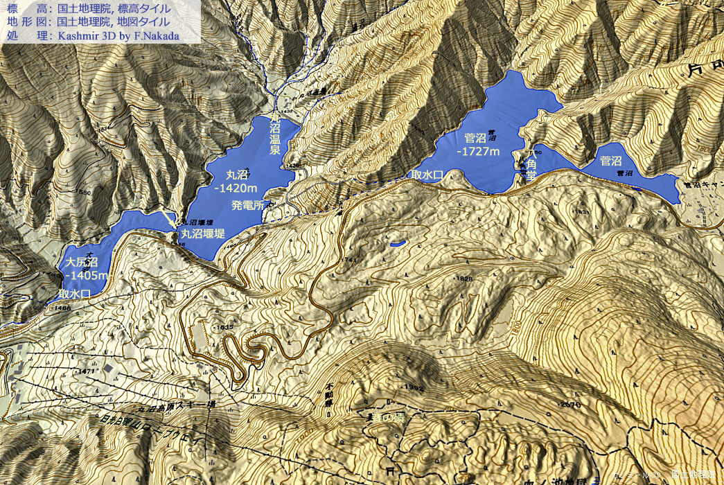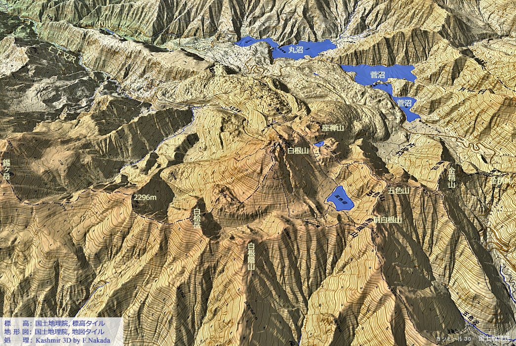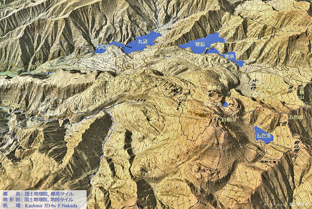 | 地形と地質の三次元イメージ : 日光白根火山と堰止湖(丸沼・大尻沼と菅沼) |