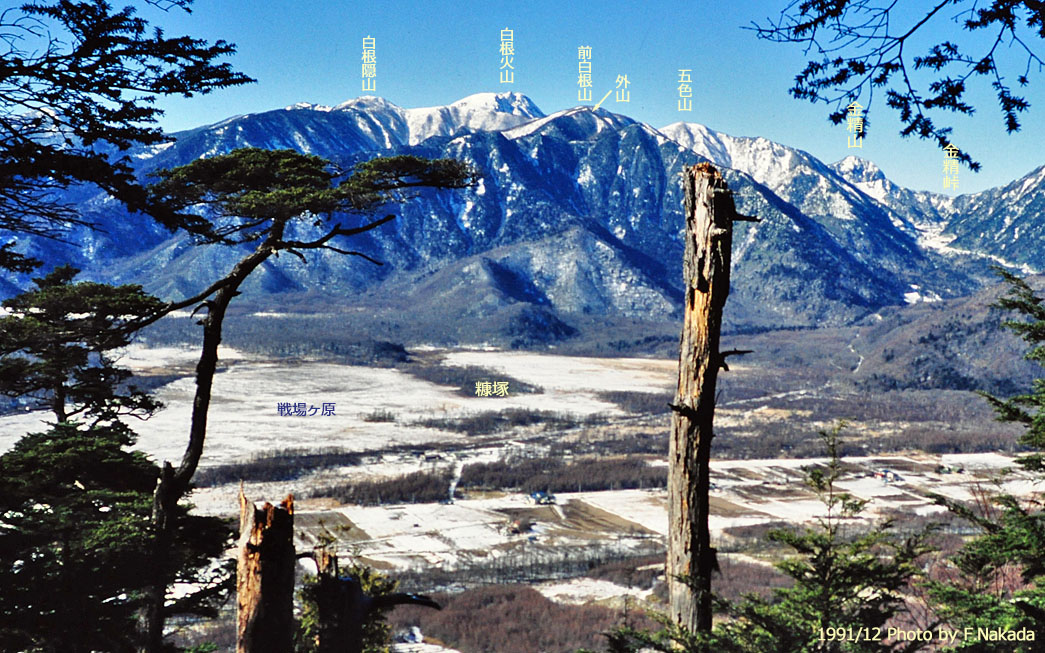 ![]() 現在,「男体山」の西斜面には登山道の記載はありませんが,この当時はちゃんと記載されていたように思います。 「戦場ヶ原」から,雪道を300mほど登ったところで,「日光白根山」の頭だけを望むことができました。 |