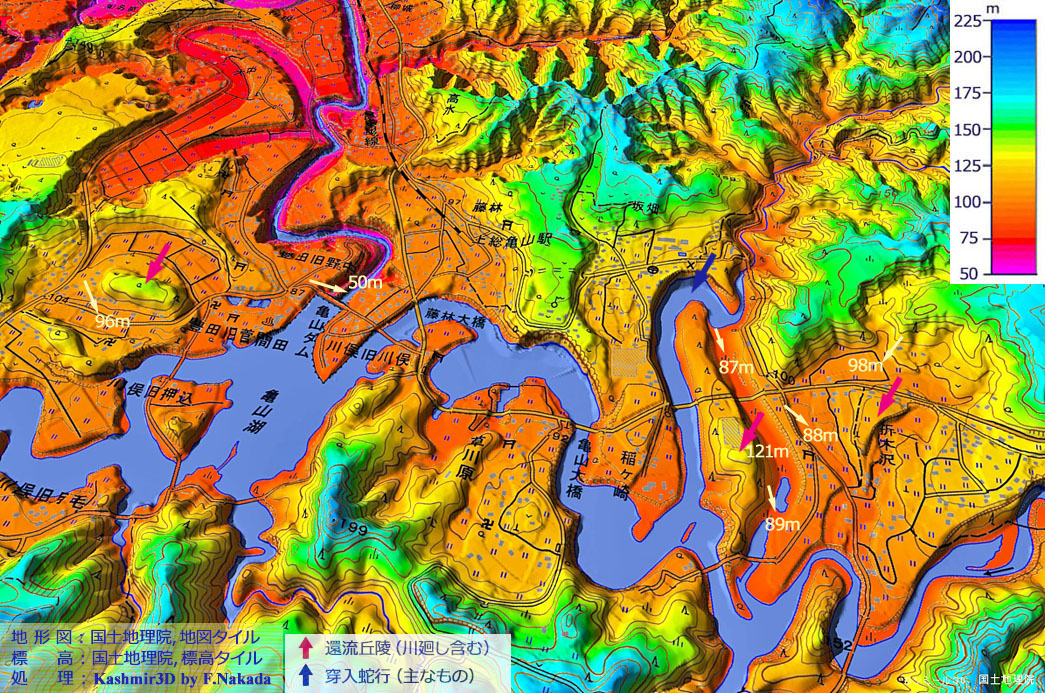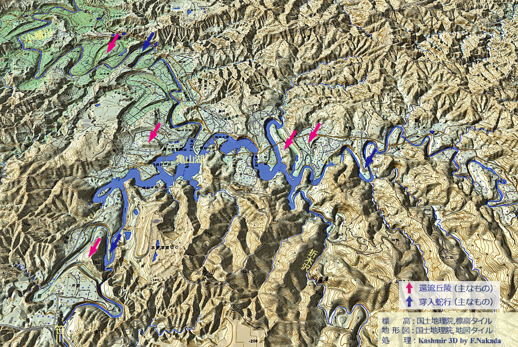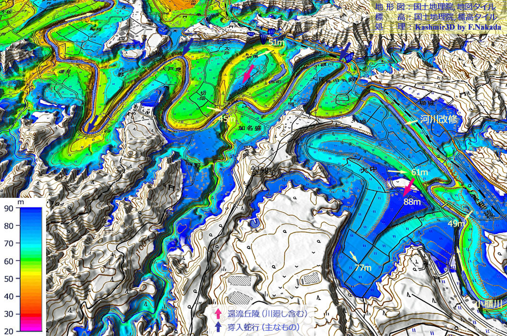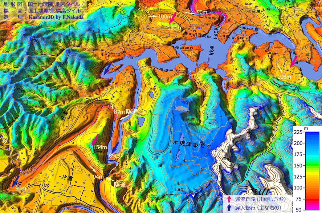 ![]() 本図の範囲は「亀山湖」の下流域です。 (1)「大中」地区で双頭型の「環流丘陵」は,環流部の最大標高差が約28m(77m-49m)ありますが,亀山ダム左岸のそれに比べると約半分です。 「穿入蛇行」であった期間が短かったのかもしれませんが,詳細は不明です。 (2)図中央上部の環流丘陵では,環流部と現河床との標高差は10m未満です。完新世になってからの環流丘陵かもしれません。 |