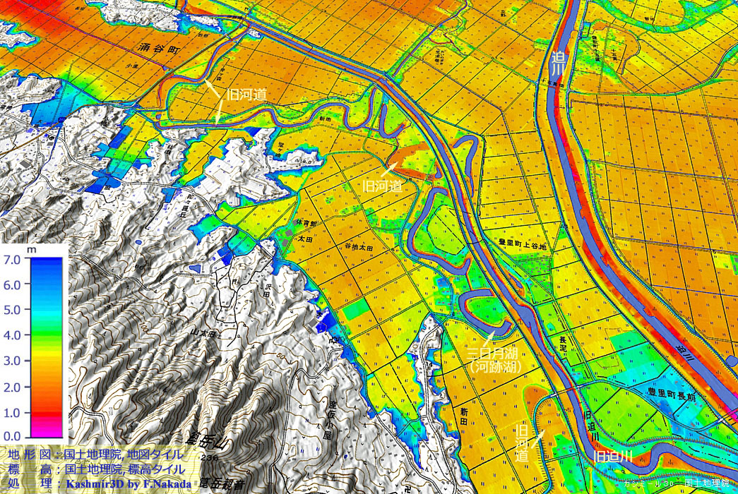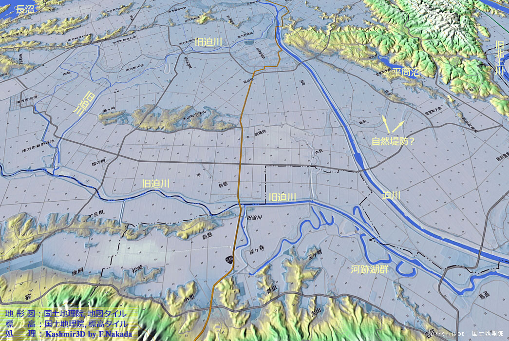 ‼マウスオーバー‼ 地図上にマウスを乗せてください。事務局が独自に作成した「標高段彩図」を表示します。![]() 栗駒山(1623m)の東斜面が源流の「迫川」は,かつて大和朝廷と奥羽の蝦夷との境界であった,とされています。 流下して石巻平野?に突入すると,そこは標高数メートル以下と言う広大な平野のため,豪雨の度に河道を変える「自由蛇行」を繰り返してきました。 図に示す「迫川」は,河川改修によって新しく開削された河道です。 バイパス(捷水路)にあたります。 「旧迫川」が,古来流れていた河道(のひとつ)ですが,自由蛇行の最も激しかった区間は,改修工事によって直線堤防が設置されています。 蛇行により曲流となった場所は,本流が切り離されて「三日月湖(河跡湖)」となっています。 |