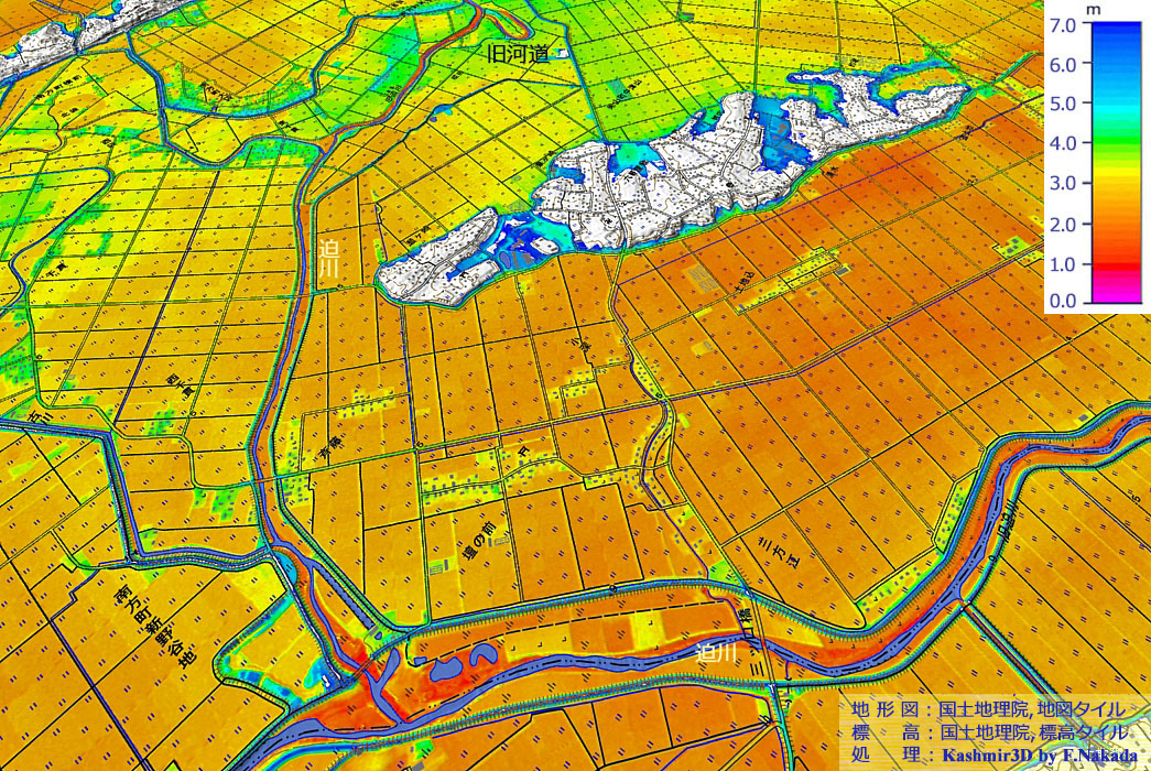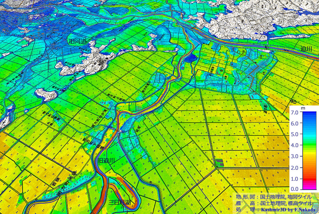 | 標高段彩図の三次元イメージ : 旧迫川付近-1 |