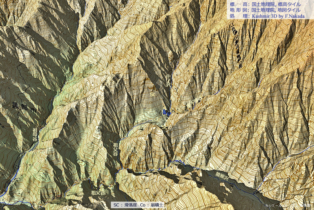 | 地形の三次元イメージ : 深層崩壊によって形成された河道閉塞箇所と二つの天然ダム湖 |