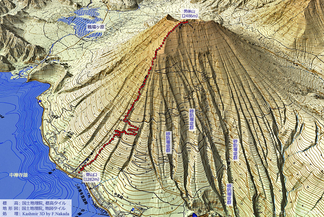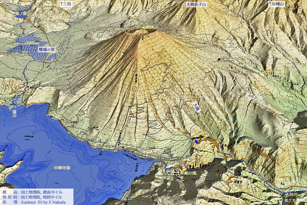 | 地形と地質の三次元イメージ : 男体山北面と御沢溶岩流 |