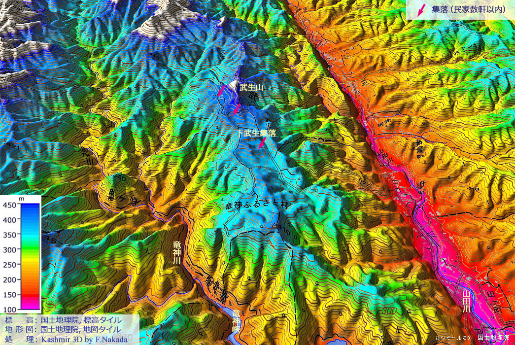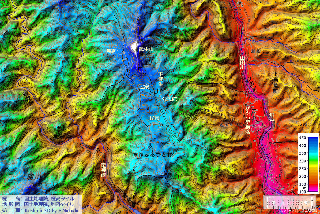 ![]() 台地状地形のメサやビュートは,日本国内にも若干程度存在しています。 しかし,その台地の上に集落が存在するのは,極めてまれだと思います。 それは,一にも二にも「水をどう確保するか」で,沢水を運んでくる労苦は計り知れないほどだからです。 なお,台地の東側を流れる「山田川」の流域には「かふち型集落」が存在しています。 |