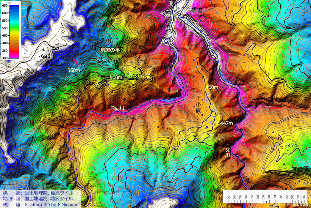![]() 「鳥屋の平集落」は,南東方向にのびる小さな枝尾根と,それに続く主稜の緩斜面に造られていますが,いずれも500mより高い場所です。 標高から集落の気温は低い筈ですが,標高650mを超える主稜が北西にあるので,冬の季節風を防いでくれる可能性があります。 一方,「下小原集落」は,日向川を挟んだ対岸で北に伸びる主稜の上,450mよりも低い標高の場所に造られています。 しかし,この主稜は左右を川に挟まれているため,防風用の楯はありません。 冬の季節風は耐えがたいものかもしれません。 |