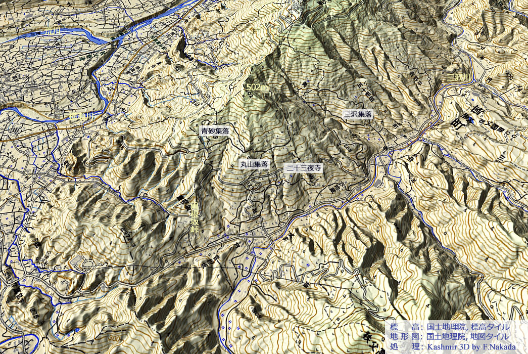 ![]() 本図に限定すると,標高約250m~約400mに,比較的高密度に民家が集まっています。 特に,標高400m付近に,数軒から十数軒の民家が集まった集落が点在するのも特徴と言えます。 飲料水と冬季の食糧確保がうまくいったから,このような場所でも生活ができたのだろうと考えています。 なお,東側を北流する「三沢川」の左岸には,「やまへ・すそみ型集落」が存在しています。 |