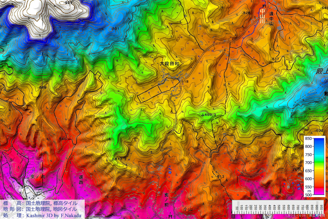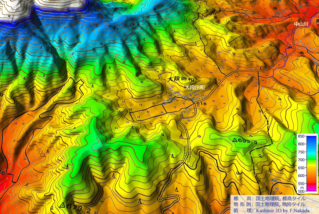 ![]() 「移川」の最上流部は農地や山地からの排水路と化しており,通常流れる水量の少ないことがわかります。 そんな移川の最上流部は,V字谷ではなく浅い皿状の地形で,幅広の谷底平野となっており,ここに「大段田和」という集落が造られています。 集落から50mも登ると峠になりますが,隣町の標高が低いため,大段田和は山上集落のようにも見えます。 |