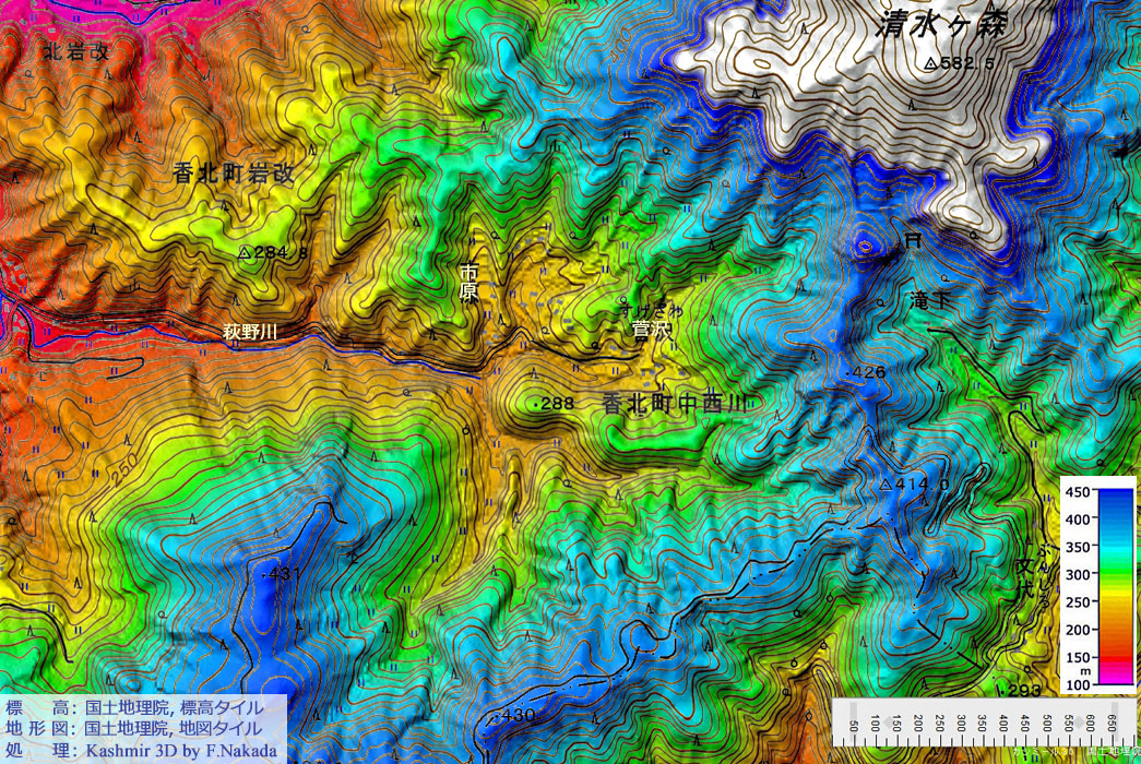 地形図上で1回クリックすると,産総研・地質調査総合センターの「1/20万 シームレス地質図(出典,下記)」を表示します。 ダブルクリックで元に戻ります。![]() 物部川は,ほぼ「仏像構造線」に沿って西南方向に流れています。 そして,萩野川は物部川中流部,左岸側の支流です。 萩野川の流域は,仏像構造線の南側になるため「四万十帯(中生代,ジュラ紀~白亜紀)」 が分布しています。 萩野川の源流部は,四万十帯のは「混在岩・付加体」です。 しかし,途中で突如流れの方向を変え,四万十帯の各地層を断ち割る様にして北流していきます。 |