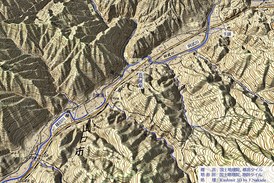 段彩図上で1回クリックすると,産総研・地質調査総合センターの「1/20万 シームレス地質図(出典,下記)」を表示します。 ダブルクリックで元に戻ります。![]() 当該集落は,活断層「津和野-岐波構造線(右横ずれ断層)」によって形成された,直線状の凹地の底にあります。 北東方向からは「阿武川」が流下し,南西方向からは「篠目川」が流下してきて,当該集落の場所で正面衝突します。 その後は西の方角に出口を見つけ,途中峡谷(長門峡)を形成しつつ,日本海へと流れ下って行きます。 周囲は中生代後期白亜紀(8千万年ほど前)の「大規模火砕流(溶結凝灰岩など)」が広く分布しており, 直線状凹地の表面にはその崩壊土砂が堆積しているものと思われます。 |