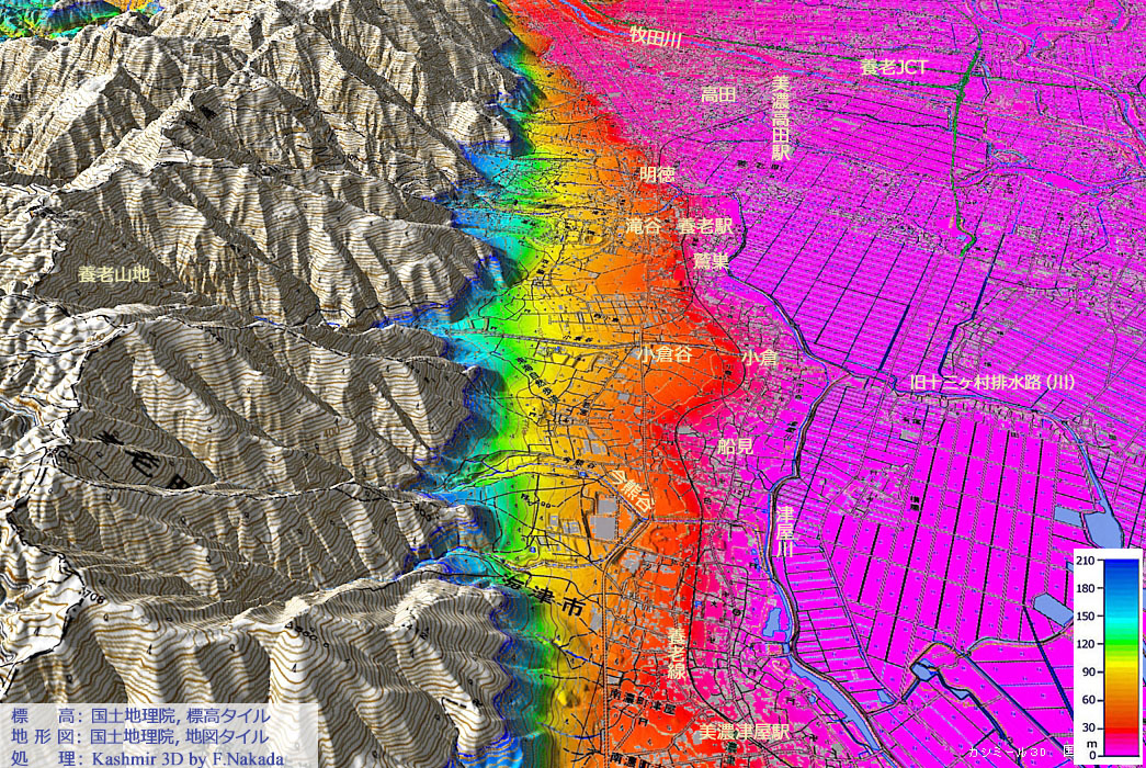 段彩図上で1回クリックすると,国土地理院の「都市圏活断層図(出典,下記)」を表示します。 ダブルクリックで元に戻ります。![]() 活断層である「養老断層」の活動は依然として続いていて,断層を境にして西側は隆起し,東側は沈降を続けています。 養老山地からの渓谷は急傾斜化で急流と化し,押し出される土砂も膨大となって,山麓を流れる揖斐川までの区間に多くの扇状地を発達させました。 各扇状地の「先端部」には,例えば「小倉集落」のような集落が数珠つなぎとなって形成されています。 養老山地東側に降った雨水が,地下水となって湧き出していたからて思われます。 |