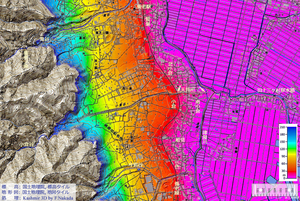 ![]() 「滝谷」,「小倉谷」や「今熊谷」などが形成した「扇状地」は連結して「複合扇状地」となっています。 扇状地端部の各集落は,その扇状地の扇型に沿って形成されています。 また,「養老電鉄養老線」の線路は,扇型をなぞって敷設されていますが,これはできるだけ凹凸の無いようにしたためでしょうね。 「小倉谷」は典型的な「天井川」です。 このことについては,以下の参考資料にアクセスしてみてください。 |