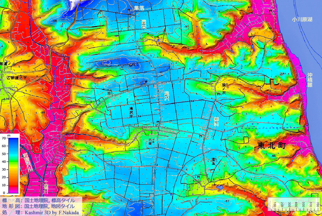 ![]() 青森県の上北地方には,「海成段丘」が広範囲に分布していることが知られています。 小川原湖の西岸沿いには「天狗岱面」という,地形的には中位段丘面に相当する「海成段丘面」が台地状に拡がっています。 「滝沢集落」や「御料集落」などの民家群(集落)は,この天狗岱段丘面のほぼ中央で形成されました。 ただし,地下水が得られにくい段丘面中央部に集落ができたのは,上水道が整備されてからのことでは,と想像します。 |