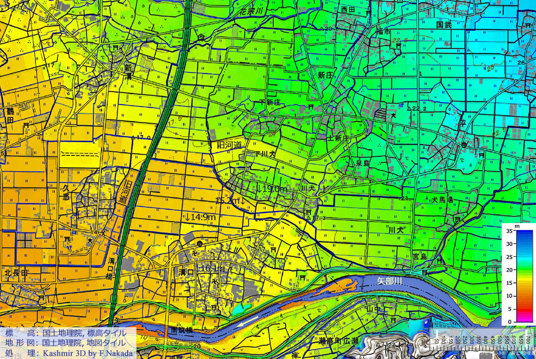 ![]() 集落のある「微高地」と「旧河道」の標高差は,概ね1m~4mと思われます。 微高地のほぼ全てが集落として,旧河道のほぼ全てが水田として利用されています。 |