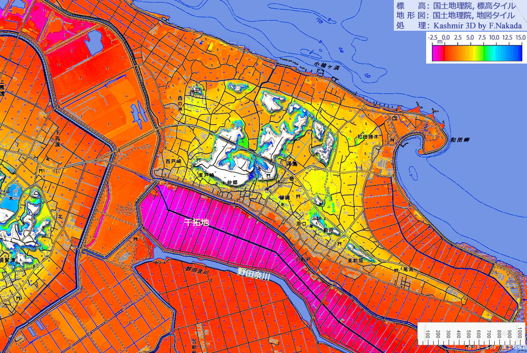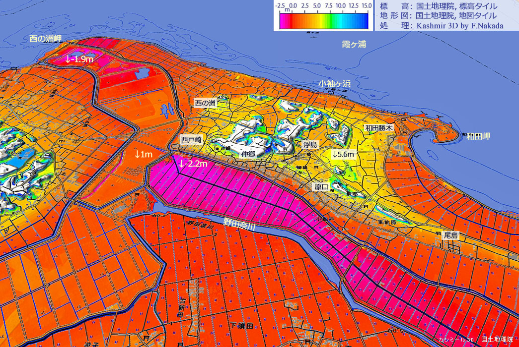 段彩図上で1回クリックすると,産総研・地質調査総合センターの「7.5万分の1 地質図幅『成田』」を表示します。 ダブルクリックで元に戻ります。![]() 霞ヶ浦の南東岸,東の「和田岬」から西の「西の洲岬」付近にかけて,大小の丘と「微高地」が広がっています。 現在は干拓や埋土によって不明瞭となっていますが,かつてこの付近は「野田奈川」によって,関東平野から切り離されていました。 地質図に記載されているように,その当時は「浮島村」といって,「仲郷地区」に村役場があったそうです。 大小の丘の群れは「常陸台地(新治台地)」の削り残しと思われ,微高地は,常陸台地から削り出された土砂の堆積物であろう,と思われます。 |