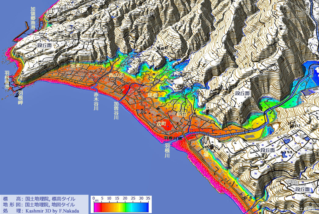 | 地形(標高段彩図)と7.5万分の1 地質図幅『室戸』の三次元イメージ |