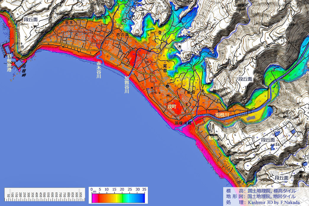 地形図(標高段彩図)上で1回クリックすると,産総研・地質調査総合センターの「7.5万分の1 地質図幅『室戸』」を表示します。 ダブルクリックで元に戻ります。![]() [再掲載した地質図は,1930年当時の集落を確認するためのものです。 海岸側の道路は戦後に造られたバイパスです。] 1930年当時,「戎町」と「船場」の集落は海岸近くにありますが,「尾僧」など他の集落は段丘崖の直下に造られていました。 最新の地形図では,小学校も含めかなりの民家が海側側にも建設されたことがわかります。 |