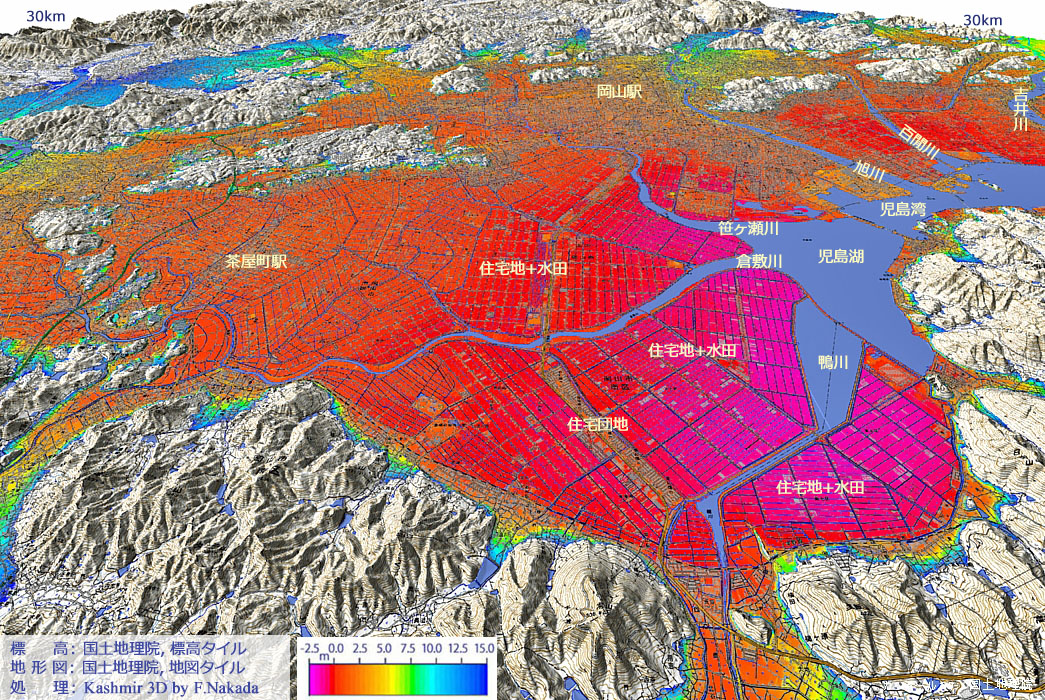 | 地形図(標高段彩図)とシームレス地質図の三次元イメージ:児島湾の奥(部分) |