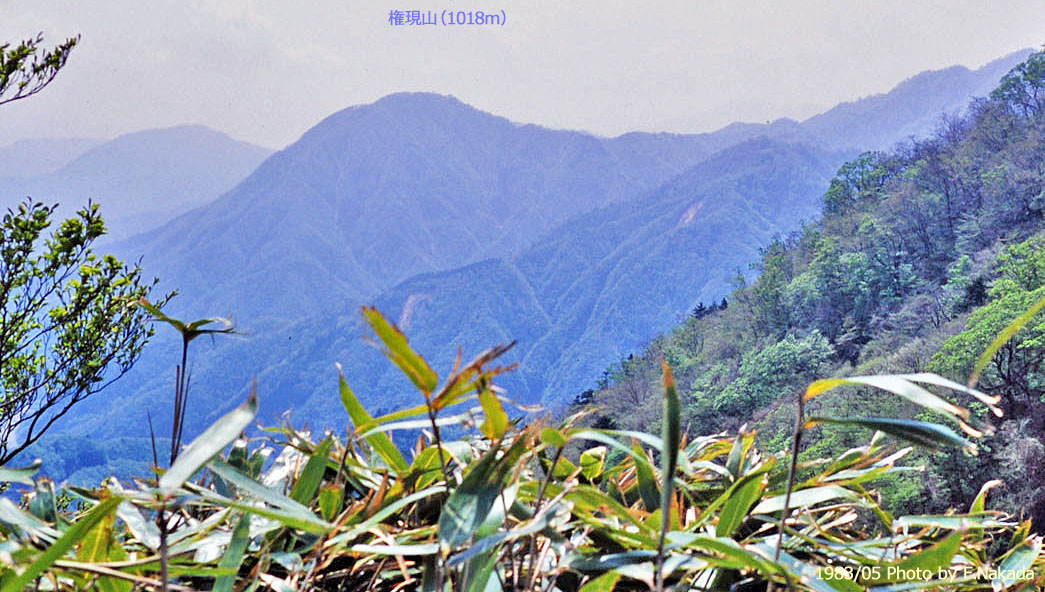 ![]() 「犬越路(峠)」付近から,約8km離れた「権現山(1018m)」の北側斜面を撮影しました。 地質図によると,権現山とその手前の尾根が「変成岩」です。 |