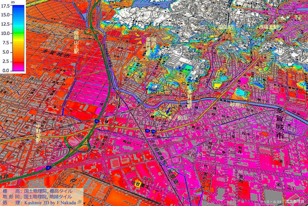 | 地形(標高段彩図)の三次元イメージ:末ノ松山付近[事務局作成] |