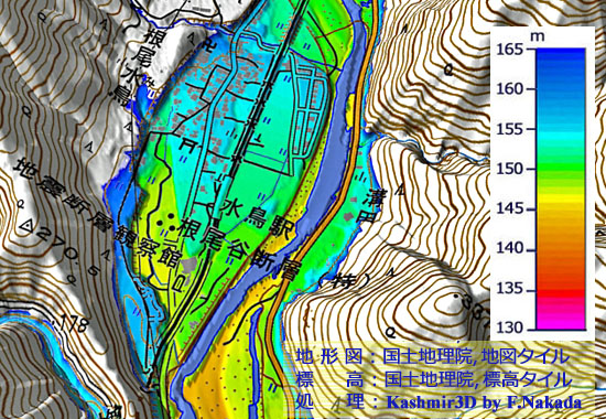 ![]() 「水鳥断層崖」による標高差は,5mDEMでも確認することができます。 |