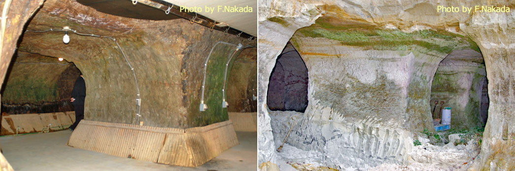 ![]() (左)地下採取場の跡地を,温泉の浴室などとして利用している「磨洞温泉(涼風荘)」の内部です。 (右)地下採取場の跡地に残された,天井を支えるための柱(残柱)です。 いずれの跡地も,「残柱」と「残柱~天盤」の形がアーチになっています。 方形よりアーチの方が,天盤の支持力は大きくなります。 |