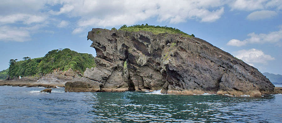 ![]() 獅子吼岬の近景です。 前足と胴体を分ける「海食洞」が写っています。 獅子に見えると言う,表面の激しい凹凸は,「塩類風化」による「タフォニ」です。 |