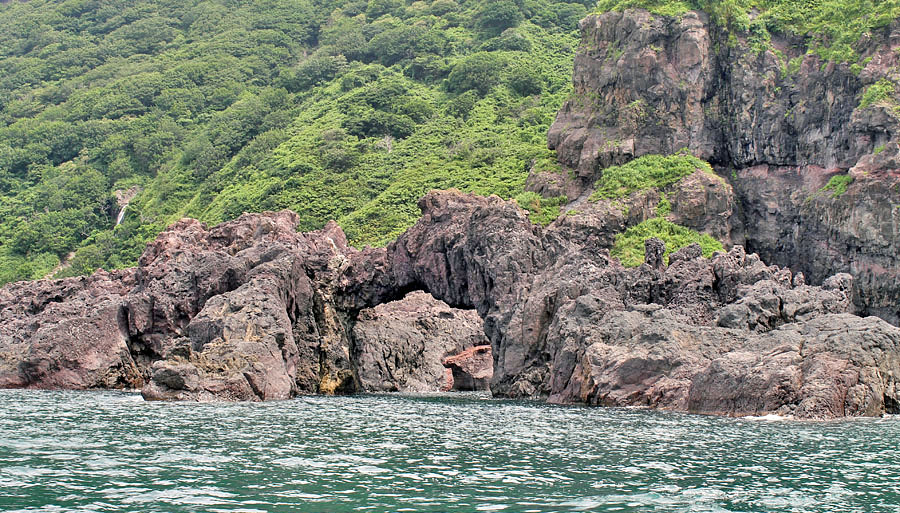 ![]() 舞台島駐車場からの大桟橋。 見づらいですが,海食洞が写っています。 |