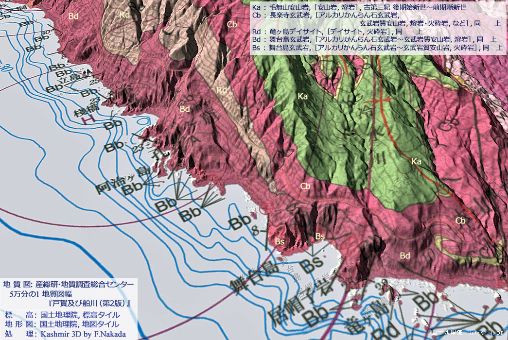 ![]() ![]() 5万分の1地質図幅『戸賀及び船川(第2版)』(出典,下記) |
