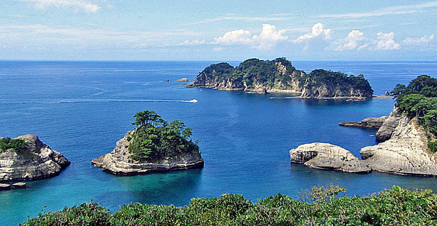 ![]() 右手前が「亀岩」で,中央手前は奇岩「蛇島」です。 右奥は通称「三四郎島(象島,中ノ島,高島)」です。 |