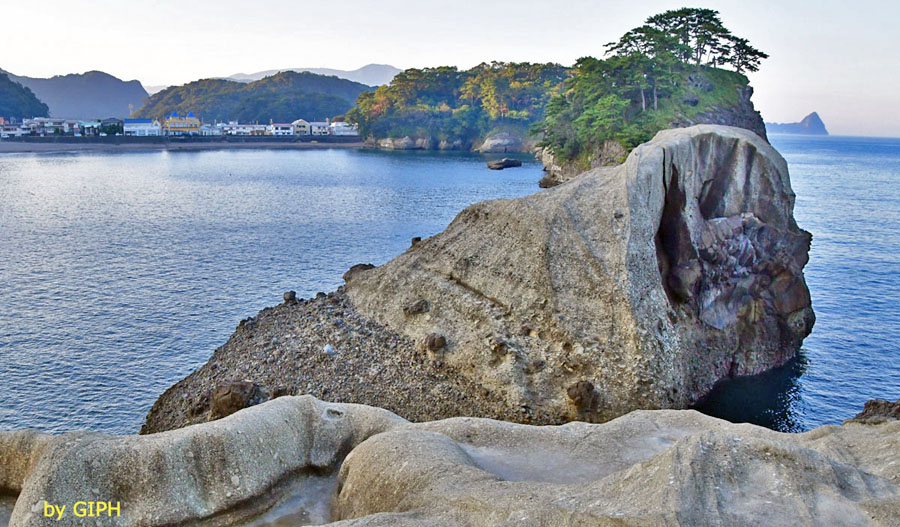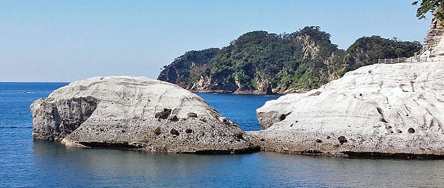 ![]() 左手前が「亀岩」で,右手前が「亀岩展望地」です。 中央奥は奇岩「三四郎島(象島)」です。 |