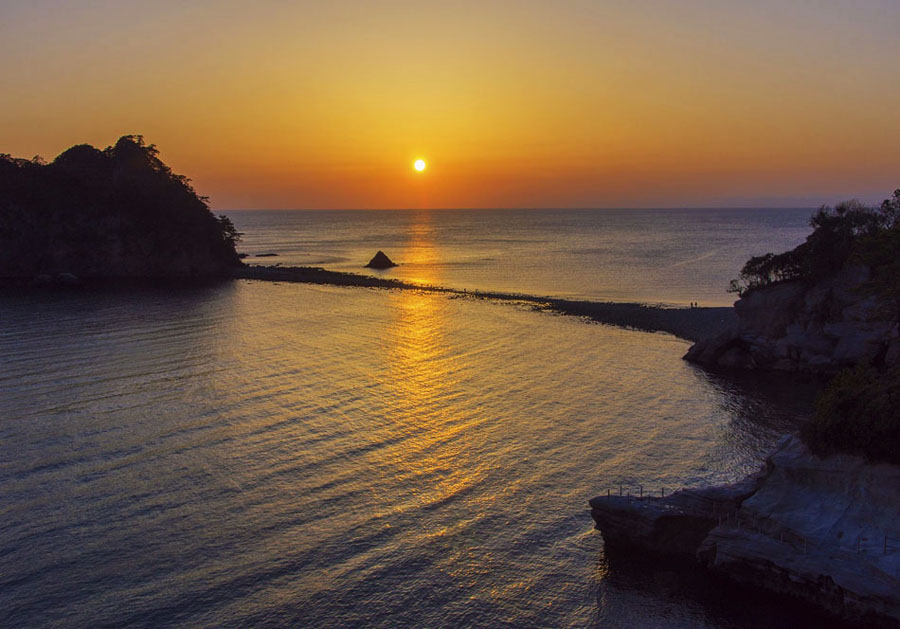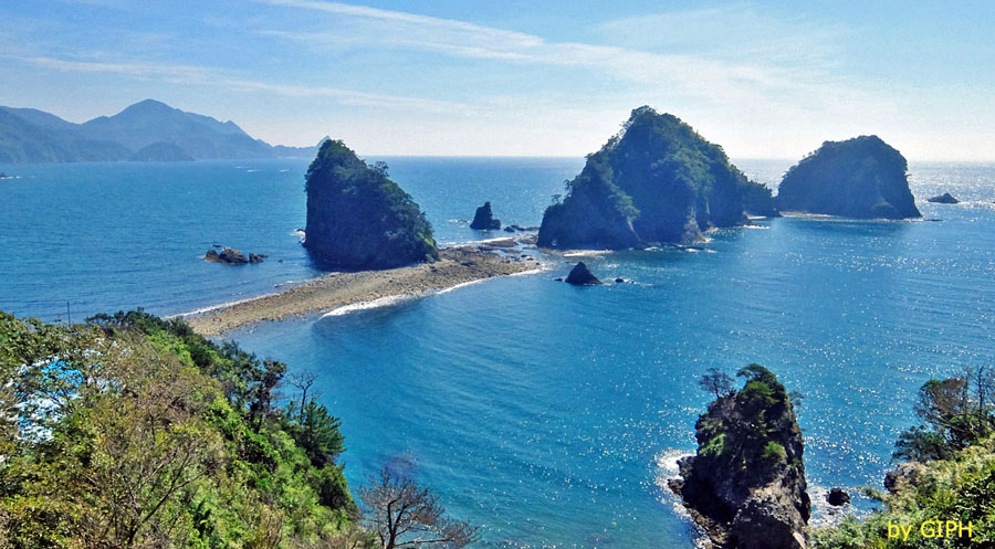 ![]() 左端が象島です。 干潮時のため「瀬浜(トンボロ)」が出現しています。 |