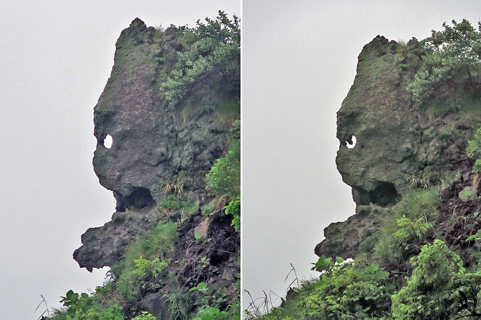 ![]() (左)天狗岩・猫岩の近景その1。(右)近景その2。 立ち位置を変えると「目玉」が現れます。 |