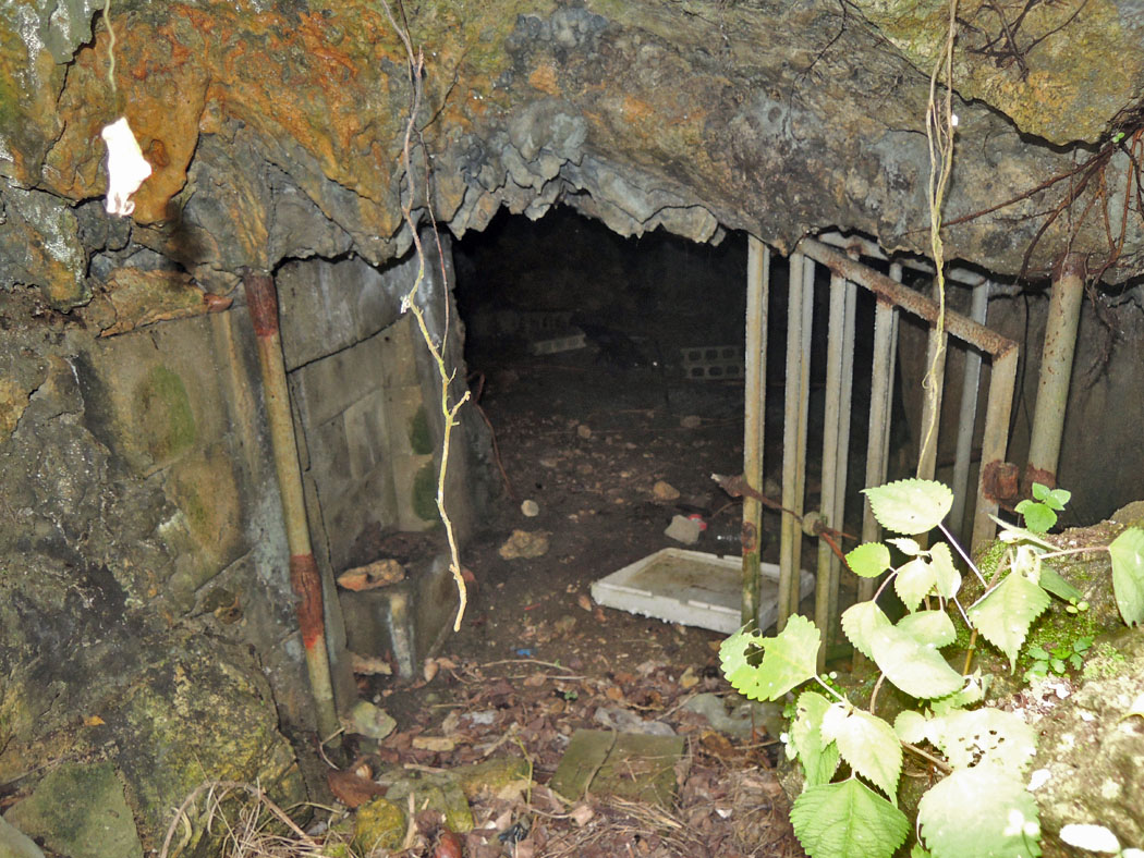 ![]() やっと見つけた壕の入り口(御嶽の右側の窪み)。 民家と民家に挟まれた狭い路地を,右に曲がった先にありました。 撮影:2016年4月。 |