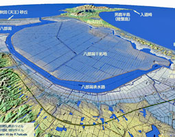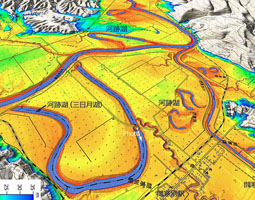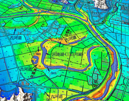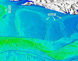 - 河跡湖(三日月湖):川が蛇行している時に,蛇行の短絡が発生したために,残された部分が湖となったものです。