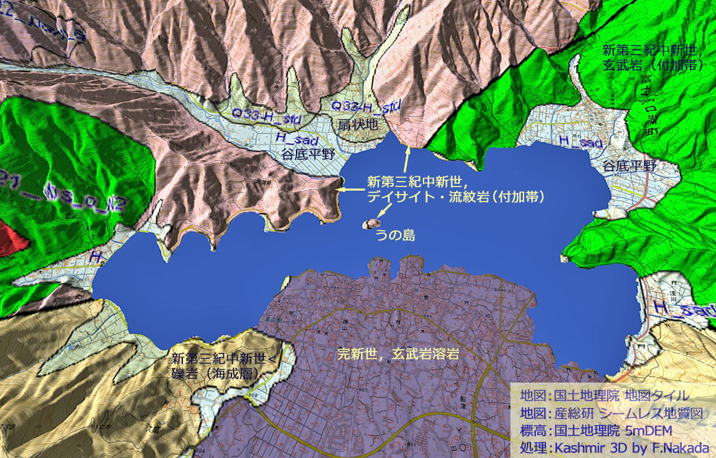 ![]() 「うの島」の地質は,北岸の付加帯と同じです。 「うの島」は付加帯の尾根の先端で,昔存在した河口湖川?は,鵜の島の南側にあったことがわかります。 |
