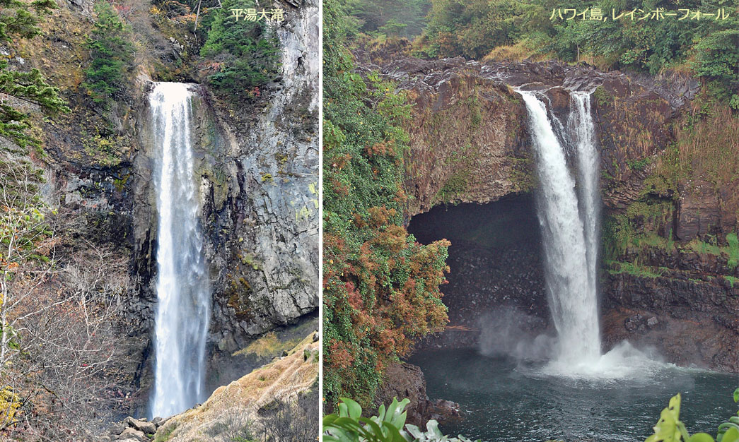 ![]() 滝の後ろの岩盤に落水が殆ど掛からないでに,「滝壺」に真っすぐ落下するような滝を「直瀑」と言います。 (左)神通川水系高原川の上流に懸かる「平湯大滝」です。 流れ下ってきた溶岩等によって,旧流路が塞がれたためにできた,と言われています。 (右)ハワイ島で最も有名な「虹の滝」です。 背後の岩盤(溶岩)に,大きな空洞ができており,滝壺も巨大です。 |