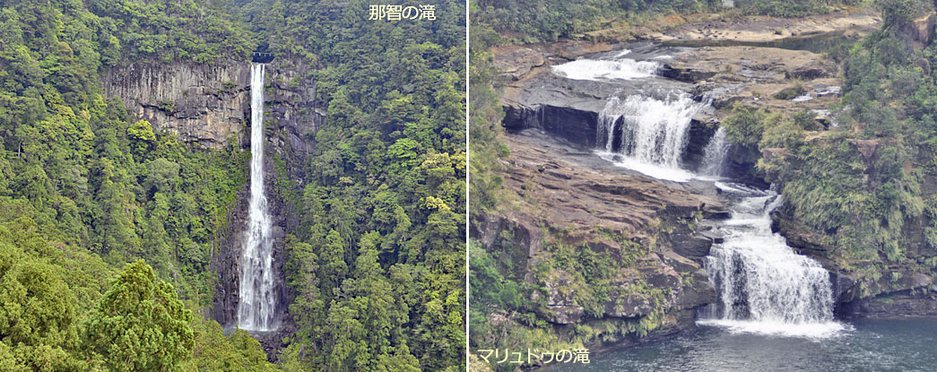 ![]() 水が落下する途中で岩盤(岩壁)に衝突している滝を「段瀑」と言いますが,厳密的にはさらなる区分が必要かもしれません。 (左)日本を代表する「那智の滝」です。 落下の途中で岩盤に衝突し,それからは岩壁をなぞる様にして落下しています。 (右)これを一つの滝とみるか,二つ以上の滝とみるか,によって分かれますが,現地ではまとめて「マリュドゥの滝」と呼んでいます。 |