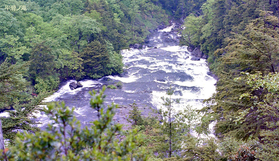 ![]() 傾斜の付いた凸凹の河床を,水が奔流となって流れ下っている状態を「渓流瀑」と呼びます。 既往資料では,「渓流瀑=滑滝」との記述もありますが,「平滑ノ滝」と「栗又の滝」が同じジャンルでは,ということで分けました。 |