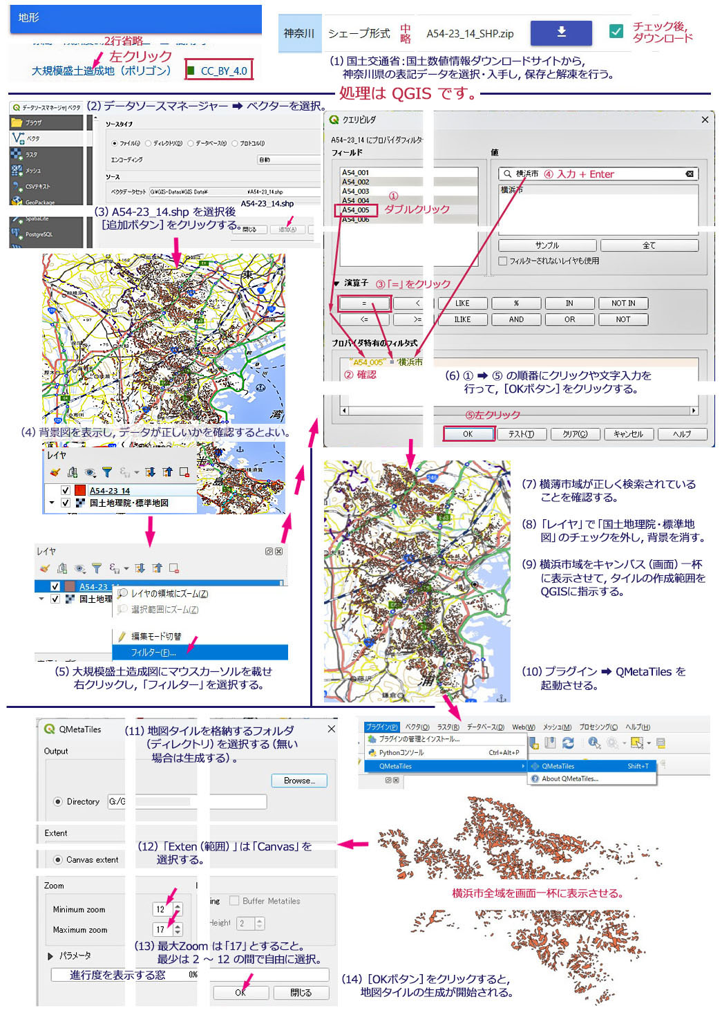 | 地図タイルへの変換 | 本例では「QGIS V.3.10」を使用しました。 以下に作成手順の概略を記載しました。 | |