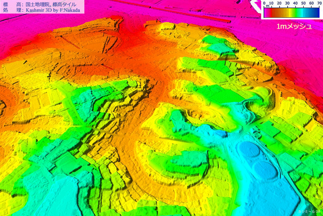 1mメッシュの標高段彩図上でマウスクリックすると「5mメッシュを使用した三次元標高段彩図」を表示します。 ダブルクリックで元に戻ります。![]() 2m刻みの標高段彩図に十分耐えうるほどの水平分解能があります。 特に円形の貯水タンクだった構造物にご注目を。 |