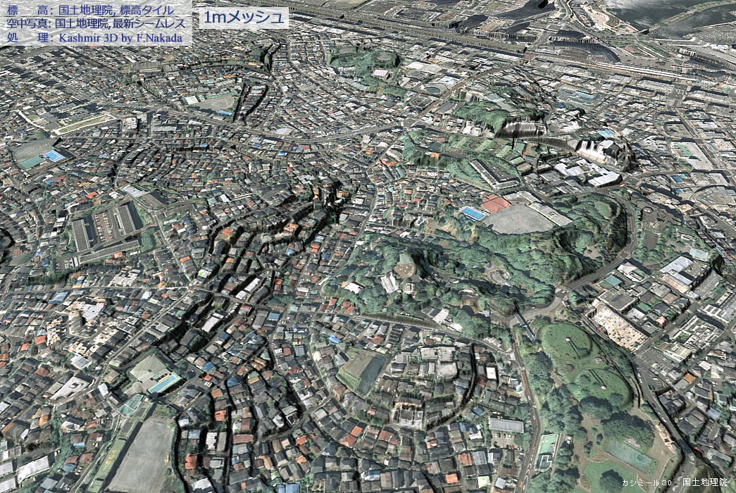 1mメッシュの三次元地形図上でマウスクリックすると「5mメッシュを使用した三次元地形図」を表示します。 ダブルクリックで元に戻ります。![]() 1mメッシュ(DEM)を使用すると,「ひな壇型造成地」がそれらしく表現されることがわかります。 |