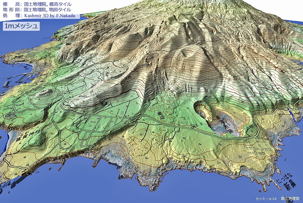 1mメッシュの三次元地形図上でマウスクリックすると「5mメッシュを使用した三次元地形図」を表示します。 ダブルクリックで元に戻ります。![]() 1mメッシュ(DEM)を使用すると,視点近傍の地表の凹凸(側火口の亀裂など)がよくわかります。 |