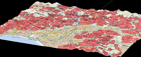 テクスチャモデル(准三次元平面図) ・地形のワイヤーフレームモデルに,空中写真や地質図などのテクスチャを貼り付けたモデルです。 土砂災害警戒区域図引用先: 国土数値情報ダウンロードサービス(神奈川県) |