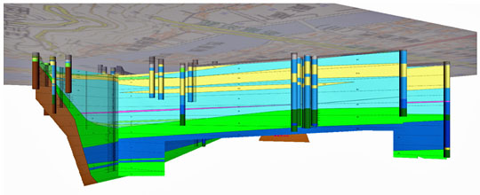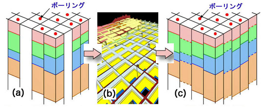 | 三次元地盤モデル | 境界面モデル | 地層境界面等のワイヤーフレームモデルに,地層区分等の属性を持つテクスチャを貼り付けたモデルです。 | |