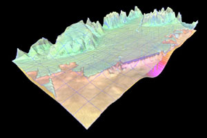 - 国土地理院から公開されている「標高データ」を入手して,ワイヤーフレームモデルを作成し,上記の警戒区域図をテクスチャとして貼り込みました。
