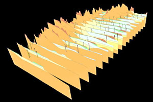 - 上記と同じ範囲の境界面モデルから,250m間隔のパネルダイアグラムを多数切り出しました。
