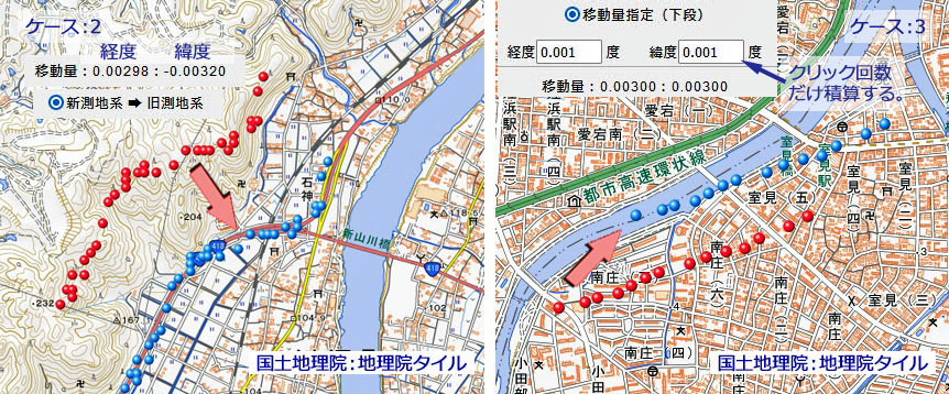 左図は,新測地系から旧測地系に変換処理した前後の孔口位置の例です。