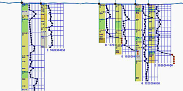複数のボーリング簡易柱状図を地形断面図上に作図する処理(ボーリングデータ群)