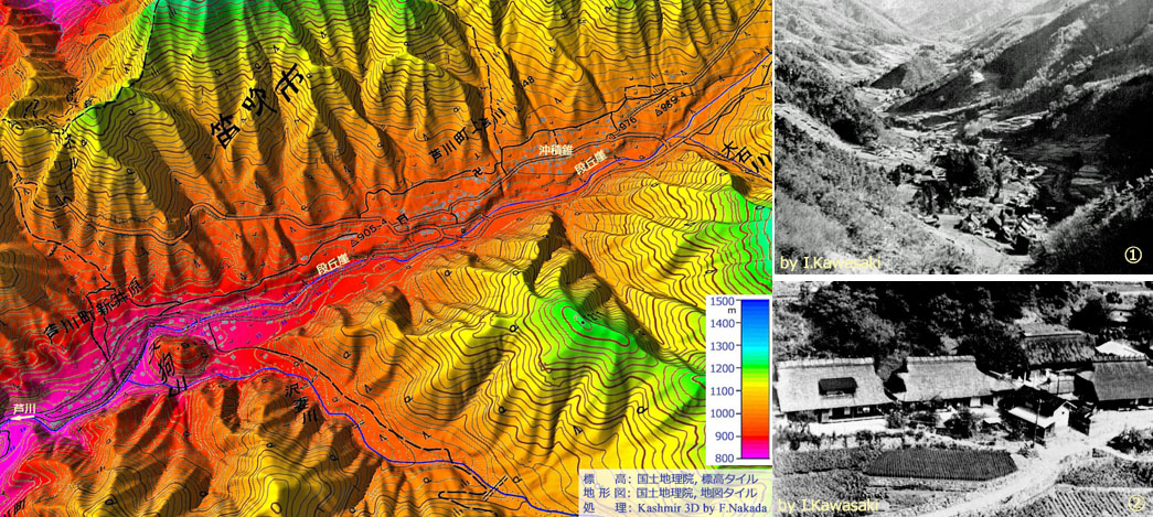 ![]() ① 写真7 : 山あいの村,芦川村の全景(御坂山地) ② 芦川村の典型的民家。 |
